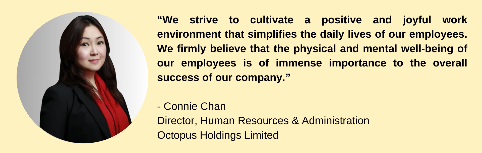 As a leading world-class tech firm, Octopus Holdings Limited takes a holistic approach to employee mental and physical well-being. “Employee well-being, both physical and mental is of the utmost importance to the company,” says Connie Chan, Octopus Holdings Limited Head of Human Resources & Administration. “It is important to focus on all aspects of employees’ well-being so they feel happier, healthier and more engaged,” Chan adds.