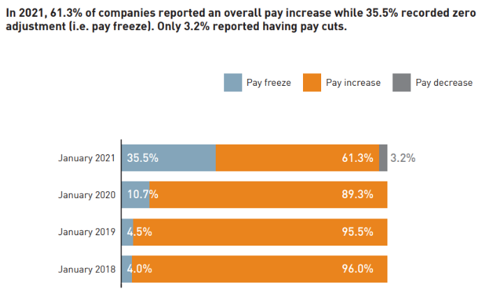 Among the organisations which provided budget adjustments for February to October 2021, which covered a total of 17,650 employees, 15.8% of them stated that they would implement a pay freeze. The forecasted overall average pay adjustment stood at 1.9%.