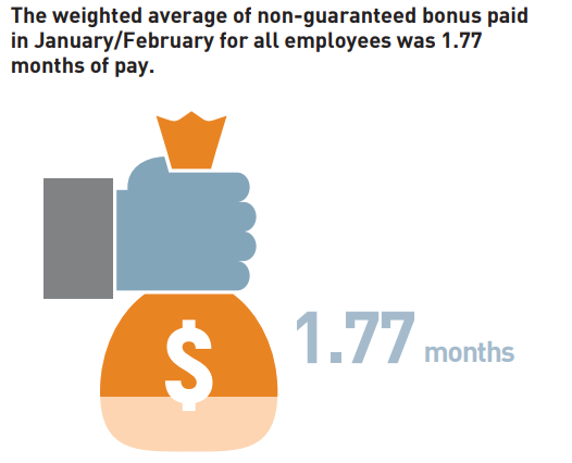 Among 48 companies who responded to the survey, the weighted average of nonguaranteed bonus paid in January/February for all employees was 1.77 months of pay. The weighted average of non-guaranteed bonus paid in January/February for top, senior, middle, and general employee levels were 6.43, 2.63, 1.95, and 1.23 months of pay respectively. This refl ected the vast discrepancy in non-guaranteed bonus paid between the C-suite and staff at other ranks.