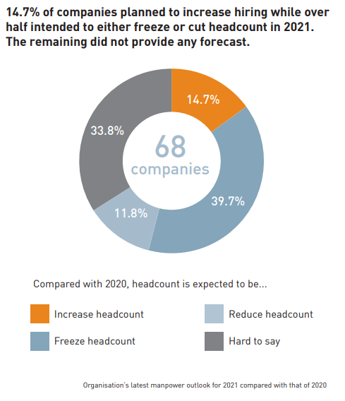 Only 14.7% of the organisations had hiring increase in the pipeline while more than half would freeze or cut headcount this year. For the companies who intended to reduce hiring, almost 90% would restructure or rearrange manpower while 75% harboured no intention to replace the reduced headcount.