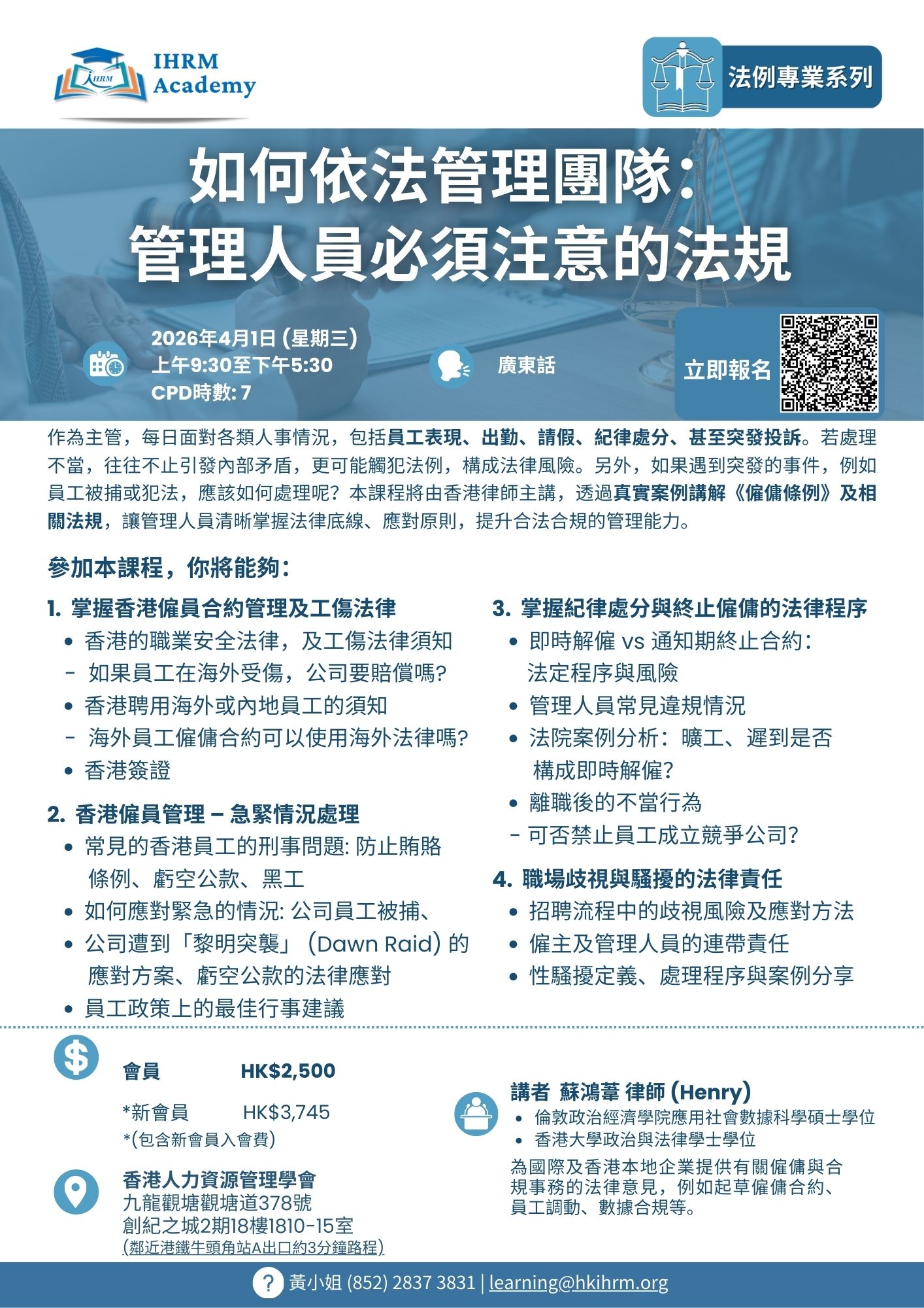作為主管,每日面對各類人事情況,包括員工表現、出勤、請假、紀律處分、甚至突發投訴。若處理不當,往往不止引發內部矛盾,更可能觸犯法例,構成法律風險。另外,如果遇到突發的事件,例如員工被捕或犯法,應該如何處理呢?本課程將由香港律師主講,透過真實案例講解《僱傭條例》及相關法規,讓管理人員清晰掌握法律底線、應對原則,提升合法合規的管理能力。