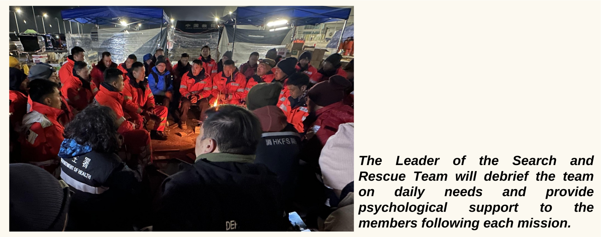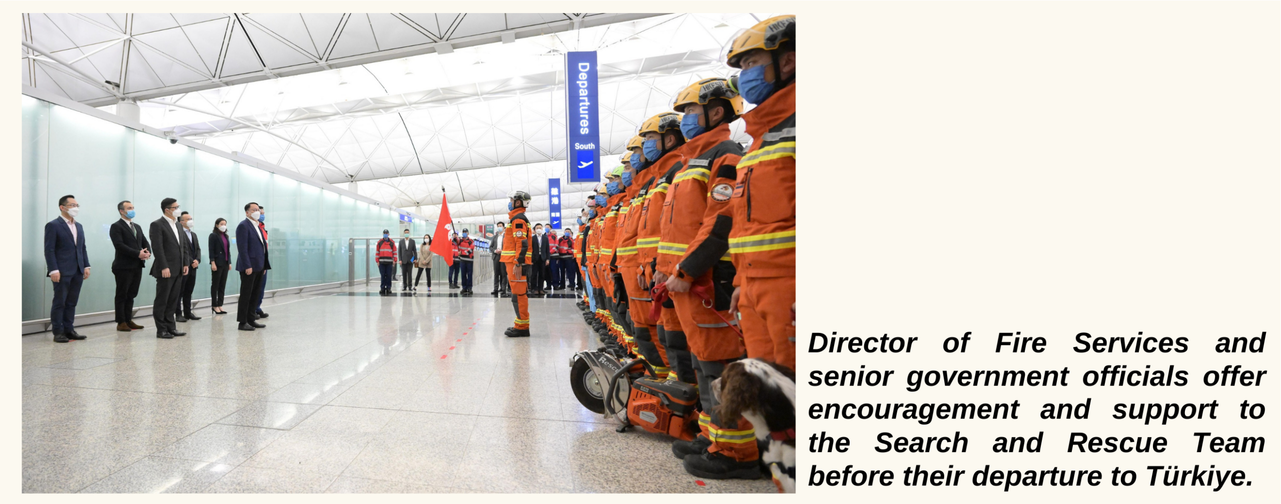 On 8 February 2023, the HKSAR Government sent a Search and Rescue Team to join the international rescue efforts for a 7.8-magnitude earthquake in Türkiye. The 59-strong Team was formed by personnel from various departments, including 49 members from the FSD. Prioritising the safety and wellness of the team, the Department provided comprehensive support before, during, and after the operation. Before the team left Hong Kong for the mission, we took various measures to enhance team members’ preparedness, including arranging briefings by our clinical psychologists, and a send-off at the airport by senior government officials and the Director of Fire Services. During the operation, we made necessary arrangements to maintain the well-being and functioning of team members, such as organising campfire sessions to enhance mutual support among them, and ensuring network accessibility via satellite phones so that they could keep in contact with their families. After the team’s return from the operation, we focused on addressing their physical, mental/emotional, and social needs. Psychological first aid sessions were arranged for them, and they received a warm welcome by senior government officials and the Director of Fire Services upon their arrival in Beijing and their return to Hong Kong. Their remarkable performance and selfless devotion throughout the nine-day mission were further recognised when they were awarded the Chief Executive’s Award for Exemplary Performance in June 2023.
