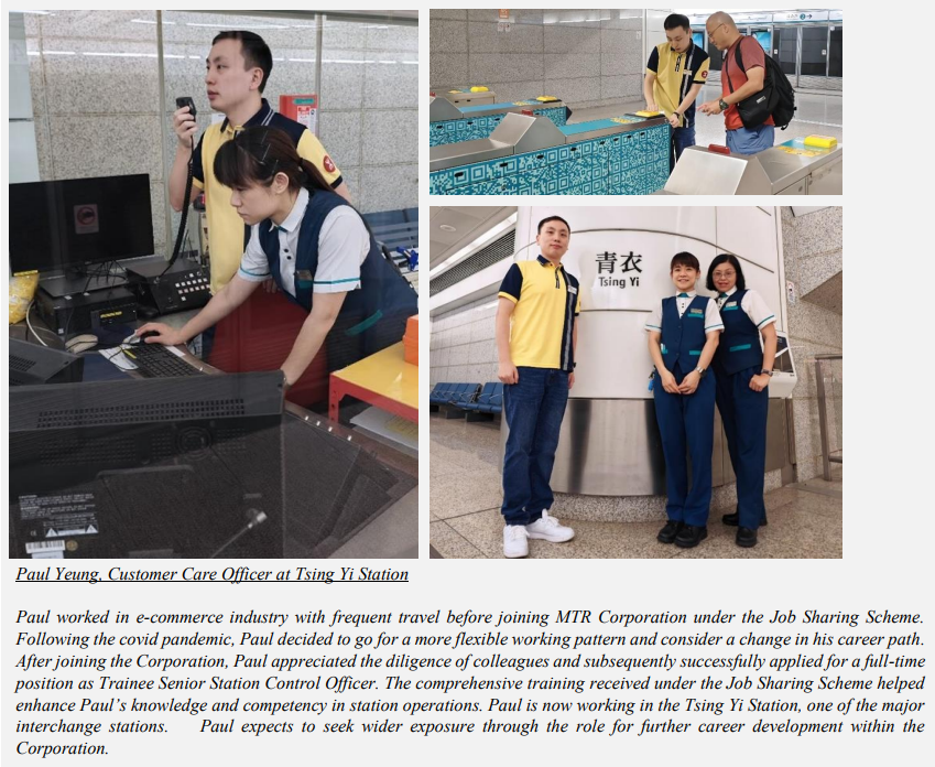 Moreover, this helps MTR tap into previously hidden workforce as the Scheme makes career in MTR available for those who cannot commit to full-time work due to individual circumstances or considerations, such as housewives, caretakers, slashers and people with education or other personal pursuits.