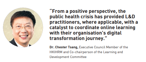 Summarising the impact of COVID-19 as reflected in the survey findings, Dr. Chester Tsang, Executive Council Member of the HKIHRM and Cochairperson of the Learning and Development Committee, believes that as organisations shifted their resources to handle the public health crisis and ensure business continuity, much of the training that was originally planned for the classroom is now being delivered online. He commented, “From a positive perspective, the public health crisis has provided learning and development (L&D) practitioners, where applicable, with a catalyst to coordinate online learning with their organisation’s digital transformation journey.” Simultaneously, the shift to digital and online learning highlighted various limitations, including budget cuts, manpower resources constraints, and a lack of digital learning IT infrastructure. “For many organisations, especially SMEs, setting up IT infrastructure and digital learning requires a lot of investment,” he noted. Despite disruptive COVID-19 challenges, such as the need for social distancing, L&D practitioners had demonstrated agility by offering training programmes delivered in different online modes and formats. The most obvious change was redesigning classroom learning to fit a variety of virtual and blendedlearning training options. Dr. Tsang said, “Virtual classes with interactive web-based tools to enhance interactions between instructors and class participants, and seminars and workshops retooled and presented as webinars, are the most common mode of delivery used by both SMEs and more sizable organisations.”