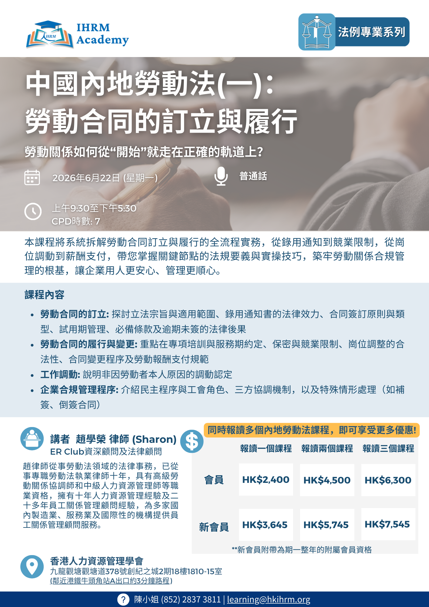 本課程將系統拆解勞動合同訂立與履行的全流程實務,從錄用通知到競業限制,從崗
