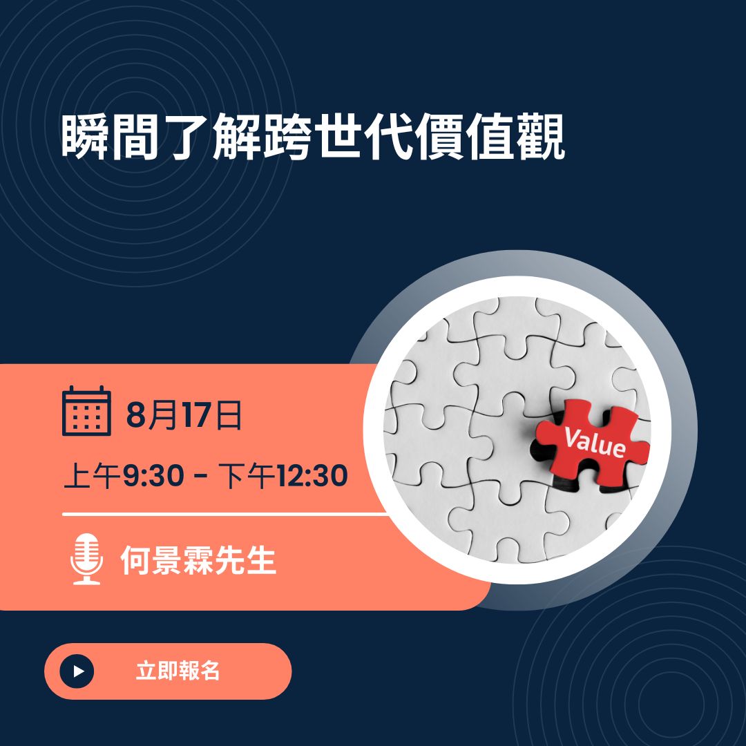 本工作坊將介紹不同世代的核心價值觀與特質,並透過互動工具及案例分享,協助參加者理解不同世代的思維模式,從而提升溝通效果,建立更具凝聚力與競爭力的跨世代團隊。
