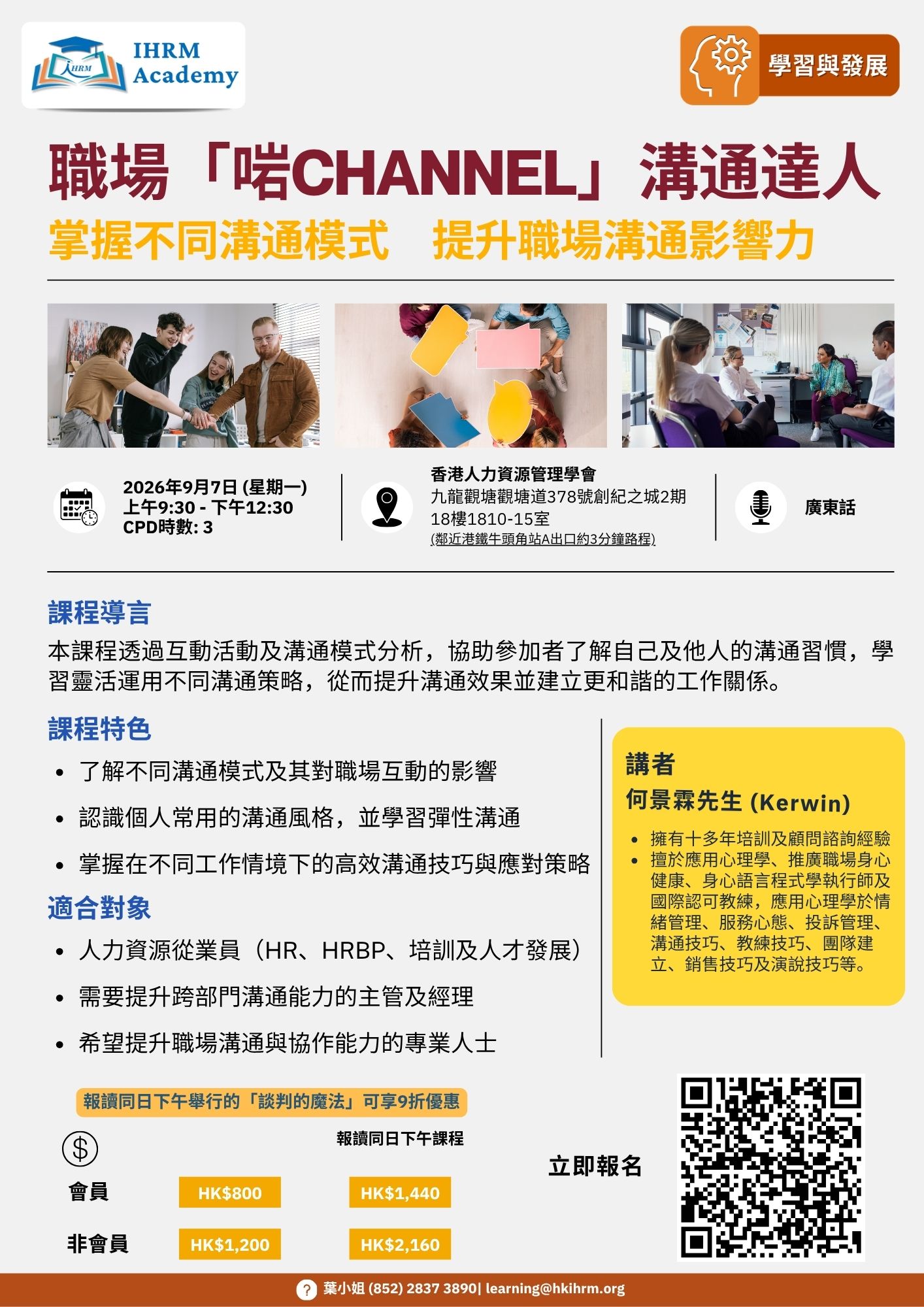 本課程透過互動活動及溝通模式分析,協助參加者了解自己及他人的溝通習慣,學習靈活運用不同溝通策略,從而提升溝通效果並建立更和諧的工作關係。
