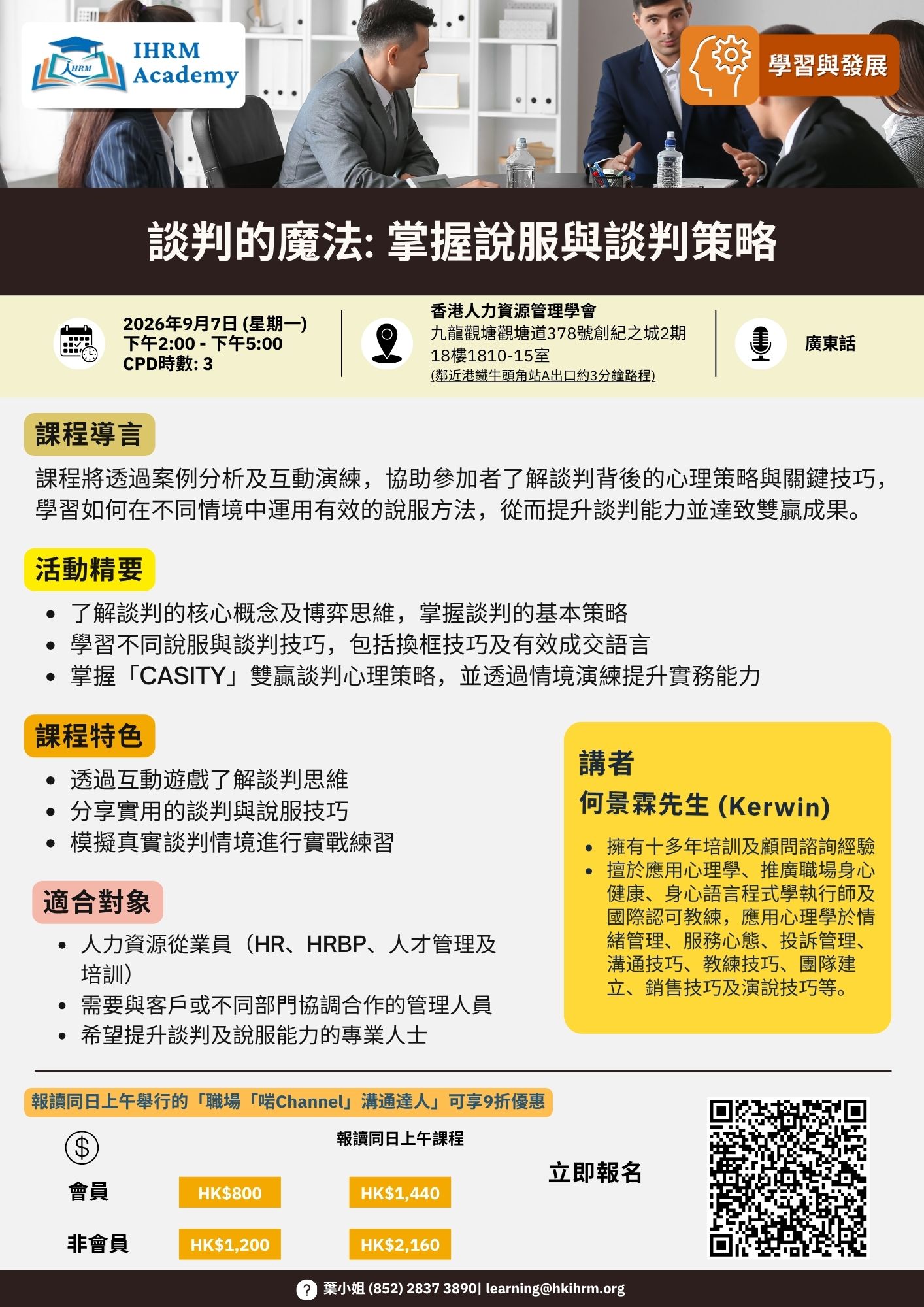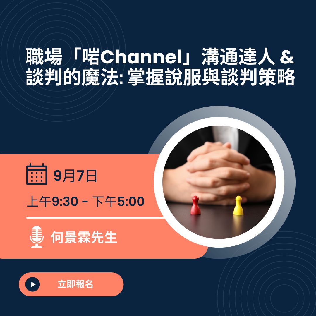 課程將透過案例分析及互動演練,協助參加者了解談判背後的心理策略與關鍵技巧,學習如何在不同情境中運用有效的說服方法,從而提升談判能力並達致雙贏成果。