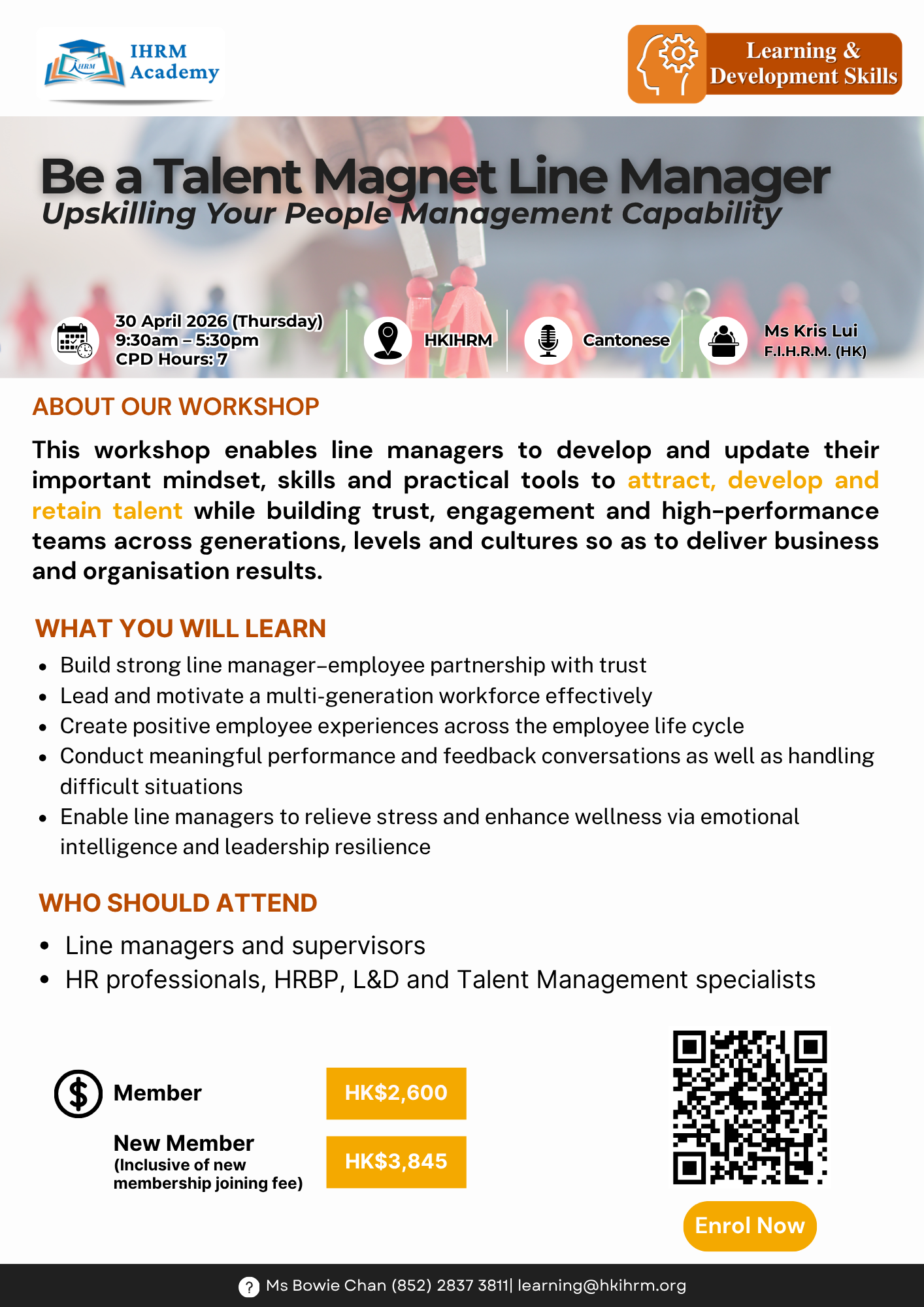 This workshop enables line managers / supervisors to develop and update their important mindset, skills and practical tools to attract, develop and retain talent while building trust, engagement and high-performance teams across generations, levels and cultures so as to deliver business and organisation results.