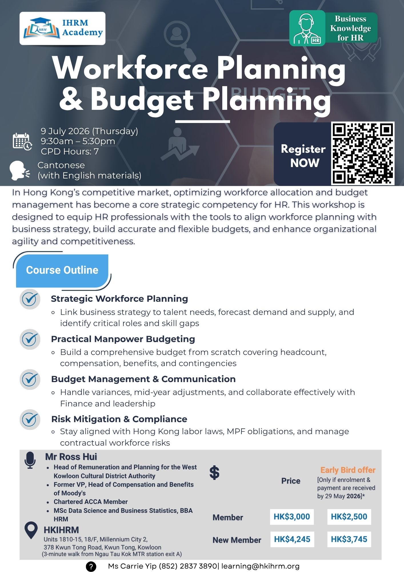 The workshop will help HR professionals identify and minimise financial and legal risks associated with workforce planning. This includes managing liabilities related to overstaffing, redundancy, and contract terms, as well as ensuring compliance with Hong Kong’s labour laws, MPF obligations, and provision liabilities in accordance with HK Accounting Standards. Participants will also learn how to manage costs related to temporary, contract, and outsourced staff while maintaining operational flexibility.